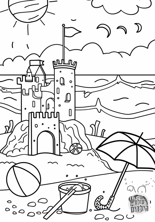 דף צביעה לקיץ | מבצר חול, שמש וים