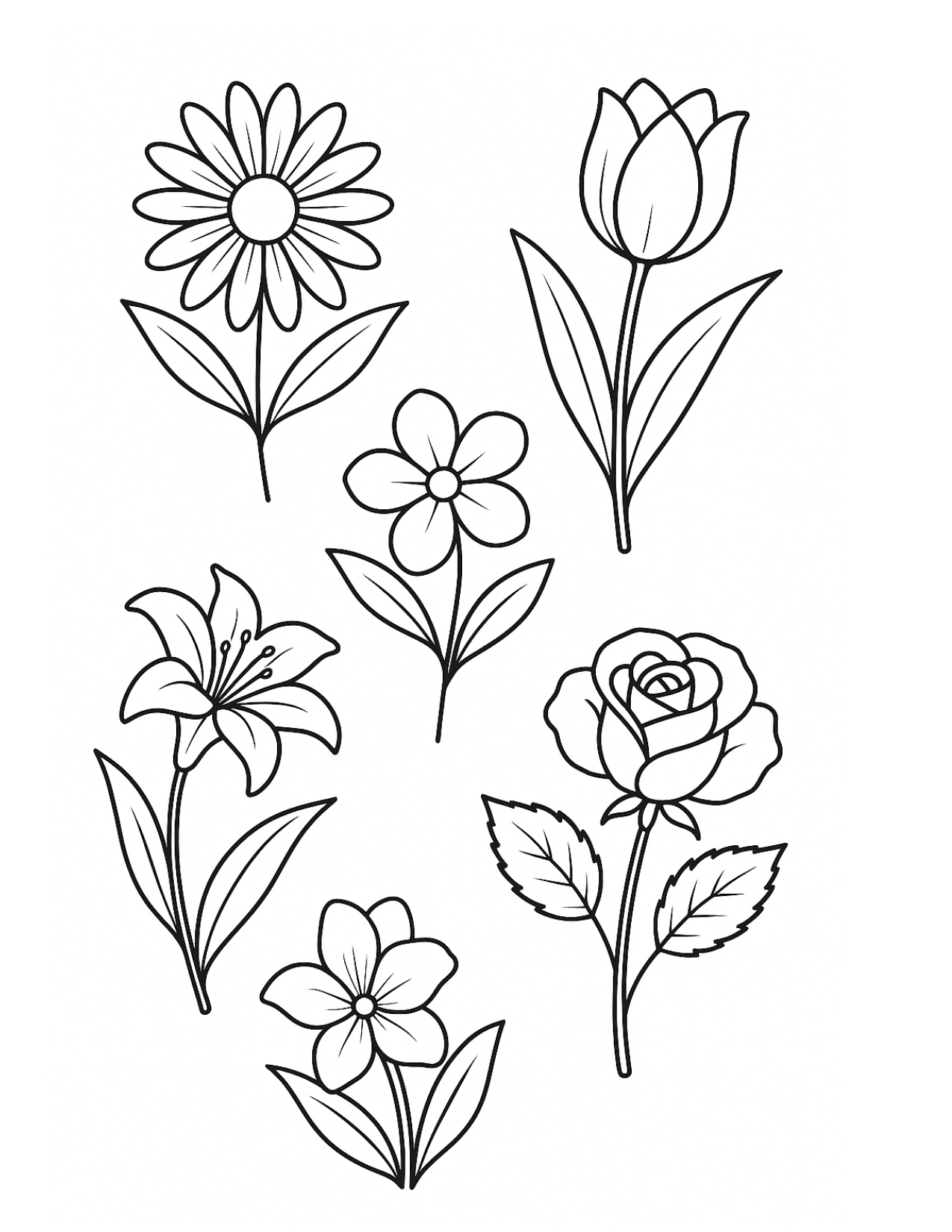 דף צביעה מקסים עם שישה סוגי פרחים שונים